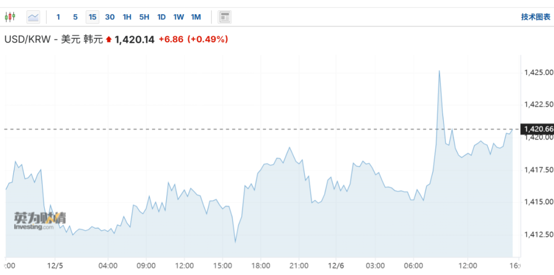 市场方面,韩国资本市场在12月6日早盘经历剧烈波动,韩国综合指数一度跳水,跌幅达到1.8%,但随后迅速回弹,最终跌幅收窄至0.56%。同时,韩元对美元汇率也一度大跌近1%,随后跌幅收窄,有交易员猜测韩国外汇当局可能卖出美元以稳定汇率。
