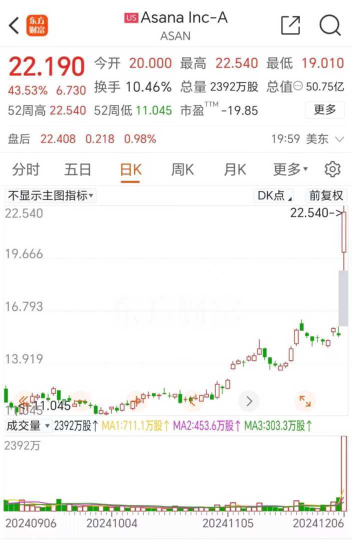 美股市场AI炒作热潮持续升温,已从硬件端延伸至软件端。多家AI应用概念股凭借出色的业绩表现和股价表现,吸引了市场广泛关注。Asana、Docusign、Rubrik等公司在周五的涨幅分别超过43%、27%、20%。这些公司均推出了AI相关产品或服务,并展现了AI变现的潜力。