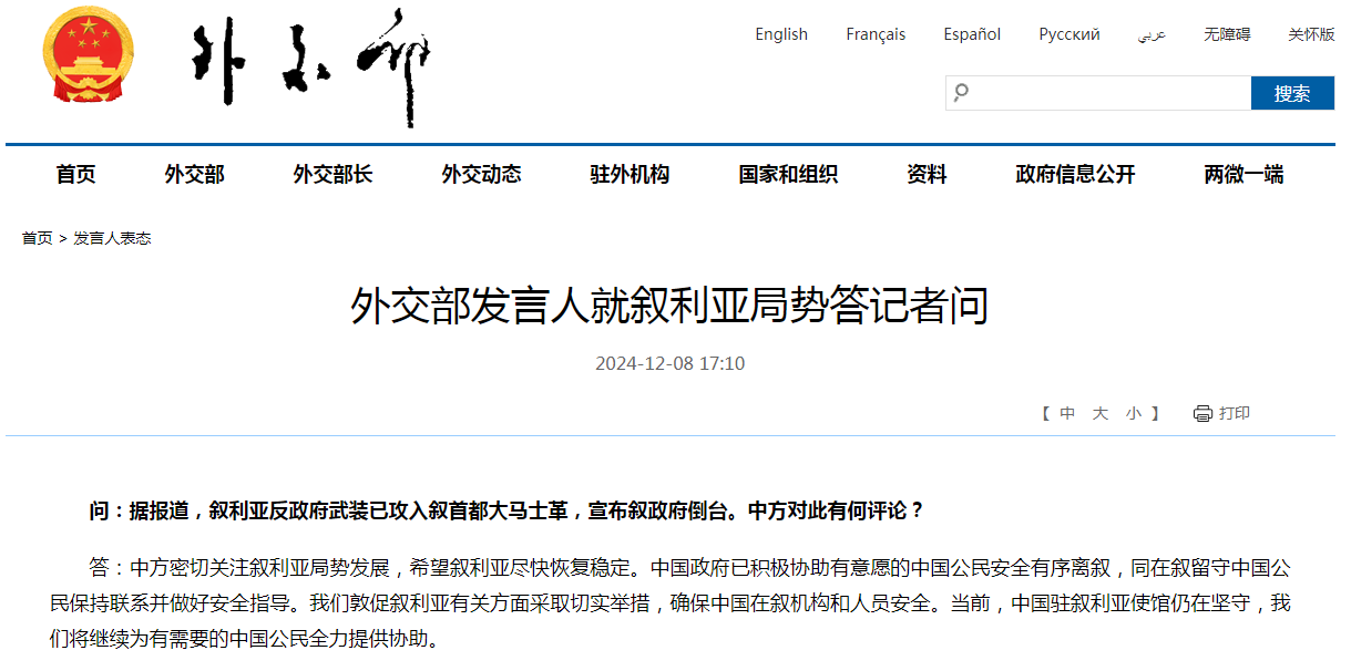 问:近期有报道称,叙利亚反政府武装已进入叙利亚首都大马士革,并宣称叙利亚政府已倒台。请问中方对此有何官方评论?