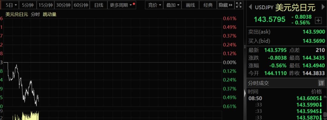 尽管上周五晚间美股收盘表现出色,但今日早盘的日本股市却未能受到提振。日经225指数在小幅低开后迅速走低,最新跌幅已扩大至1.2%以上。与此同时,日元汇率持续攀升,已接近143水平。