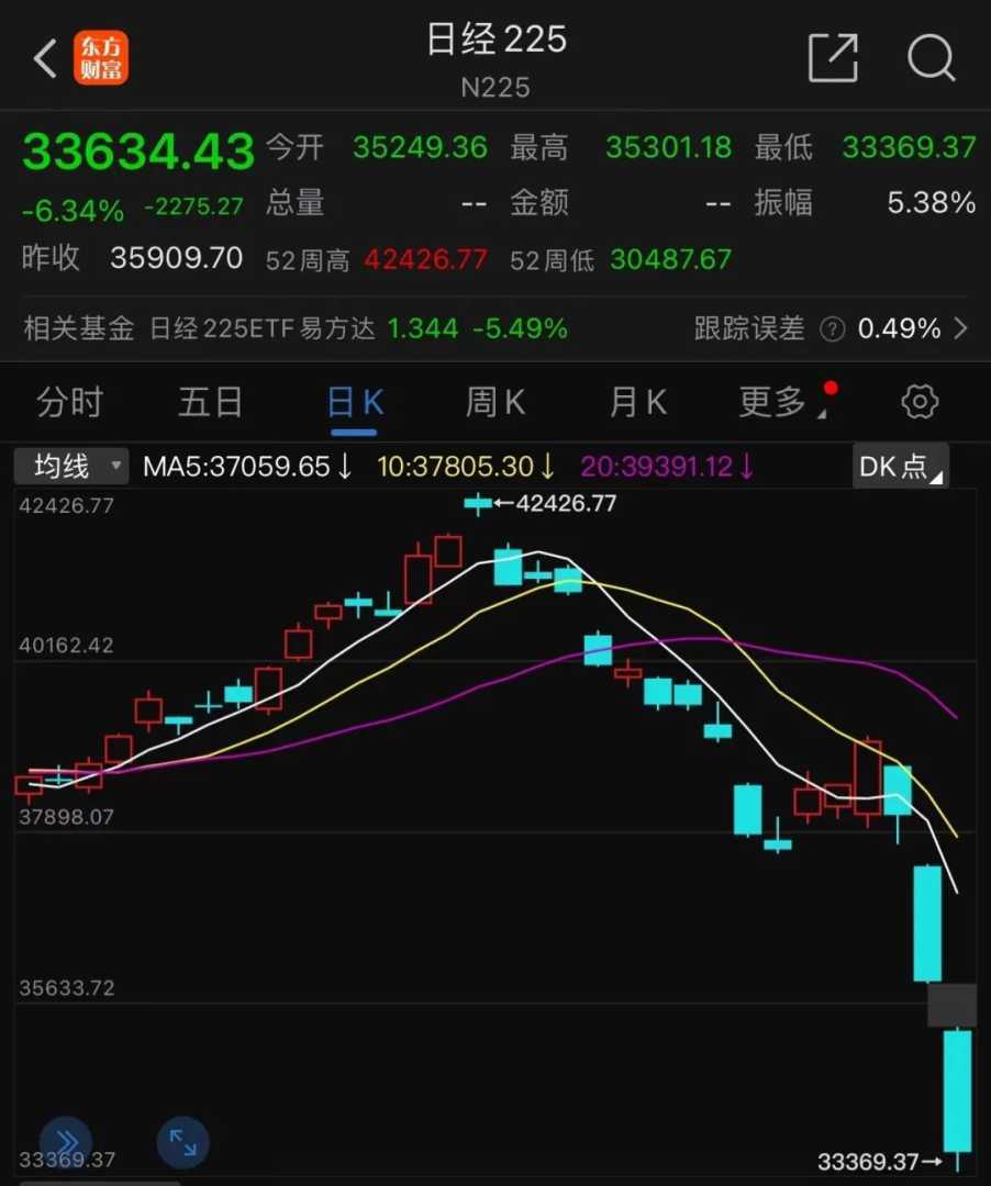 日经225指数开盘后迅速下挫,跌破34000点大关,盘中跌幅一度超过7%,市场恐慌情绪蔓延。与此同时,日本东证指数也遭受重击,触发熔断机制,市场交投陷入停滞。