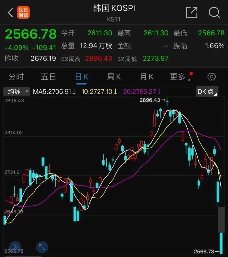 韩国KOSPI指数同样未能幸免,跌幅超过4%,市场悲观情绪浓厚。