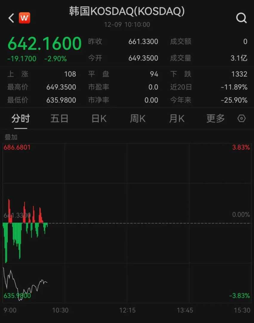 12月9日早间,韩国股市突发崩盘,韩国综合指数一度暴跌2%,KOSDAQ指数更是接近3%的跌幅,KOSPI指数也一度下跌近2%,创下自2023年11月3日以来的新低,该指数自3月高点已累计回撤30%。