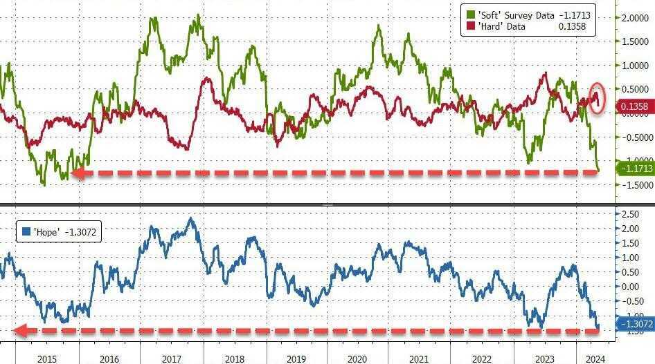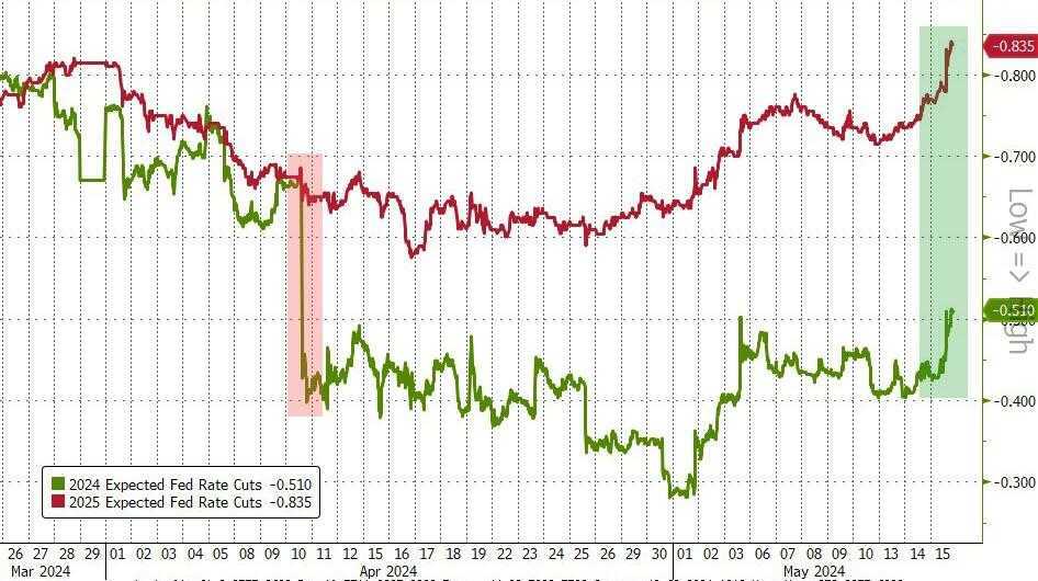 上述几组最新数据也进一步证明,美国“软数据”与“硬数据”当前正开始同步回落。花旗编制的美国经济惊奇指数已陷入深度负值区域,与今年一季度的火热数据形成鲜明对比。在CPI和零售销售数据发布后,联邦基金利率期货交易员预计美联储今年将降息51个基点,周二的预期为45个基点;交易员还预计2025年美联储将再降息至少三次。