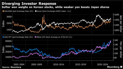韩国和日本在汇率问题上的区别在于投资者反应。日元走软提振日本股市,而韩元走软则导致韩国市场股价下跌。进口成本上升挤压利润空间,而韩元贬值对出口的提振作用有限。投资者还担忧韩元快速下滑破坏金融市场稳定。