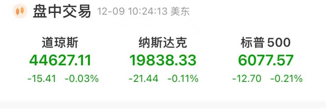 北京时间12月9日晚间,美股市场呈现小幅低开态势,截至发稿时,纳指微跌0.11%,标普500指数下跌0.21%,道指则微跌0.03%。