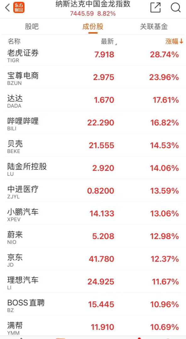 然而,在美股市场整体低迷的背景下,纳斯达克中国金龙指数却表现出色,涨幅一度飙升至10%,热门中概股也集体迎来了大涨。截至发稿,纳斯达克中国金龙指数涨幅仍高达8.82%。其中,老虎证券股价飙升近29%,宝尊电商涨幅超过23.96%,富途证券上涨超过23%,哔哩哔哩也上涨近17%。此外,蔚来汽车、小鹏汽车、爱奇艺、京东、拼多多、理想汽车等知名企业股价也纷纷大涨。