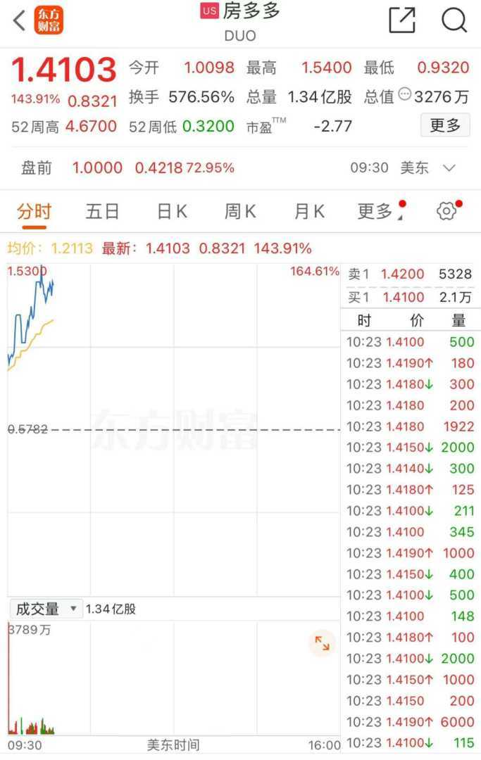 值得注意的是,房多多美股盘中第三次触发熔断,熔断前股价暴涨147.32%,报1.43美元,总市值达到3300万美元。截至发稿,房多多股价涨幅仍高达143.91%,报1.41美元。