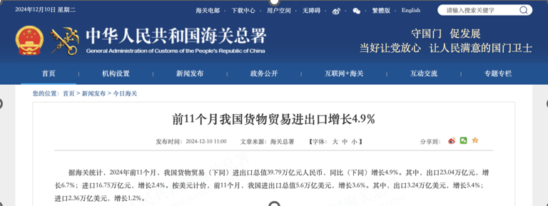 海关总署10日公布最新数据,今年前11个月,我国货物贸易进出口总值达到39.79万亿元人民币,同比增长4.9%。其中,出口额为23.04万亿元,增长6.7%;进口额为16.75万亿元,增长2.4%。