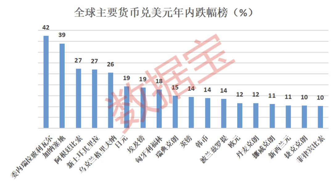 据证券时报·数据宝统计,今年以来,全球已有18种货币兑美元的汇率跌幅超过10%,更有5种货币跌幅超过20%。值得注意的是,全球五大结算货币中的四大货币兑美元全线下跌,其中日元跌幅居首,超过19%,而人民币表现相对坚挺,跌幅超过8%。