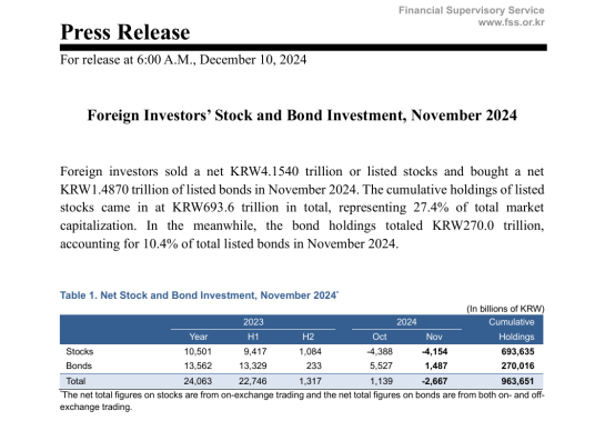 然而,数据显示,在政治动荡爆发之前,外资已经开始逃离韩国股市。韩国官方今日公布的数据显示,11月外籍投资者在韩国股票市场净卖出4.154万亿韩元(约合人民币210亿元),连续4个月净抛售韩国股票。同时,外籍投资者在韩国债券市场则净买入1.48万亿韩元(约合人民币75亿元)。