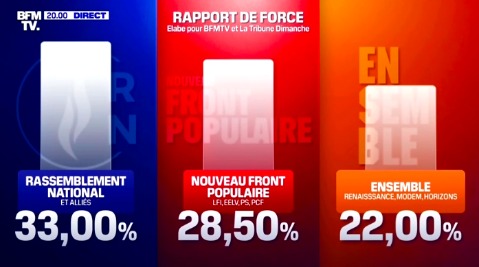 根据民调数据,国民联盟得票率约33%,领先左翼联盟“新人民阵线”的28%及执政党复兴党及中间派联盟的22%。法国国民议会选举共577个席位,采取两轮投票制。由于投票率高,票数分散,约300个选区可能面临“三方决选”。知名民调机构益普索预测,第二轮可能有285至315个席位面临三方竞争。