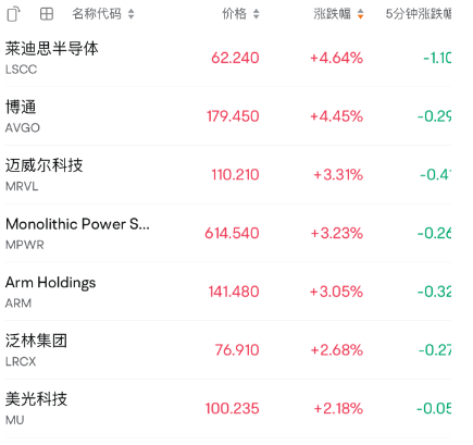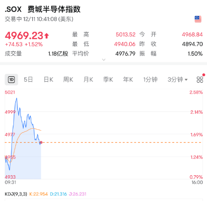 受美国CPI数据影响,道琼斯指数微涨,而纳斯达克指数大涨超1.3%,标普500指数涨约0.7%。芯片股普遍上涨,费城半导体指数一度涨超2%,其中博通涨超4%,据传苹果正与博通合作开发AI芯片。