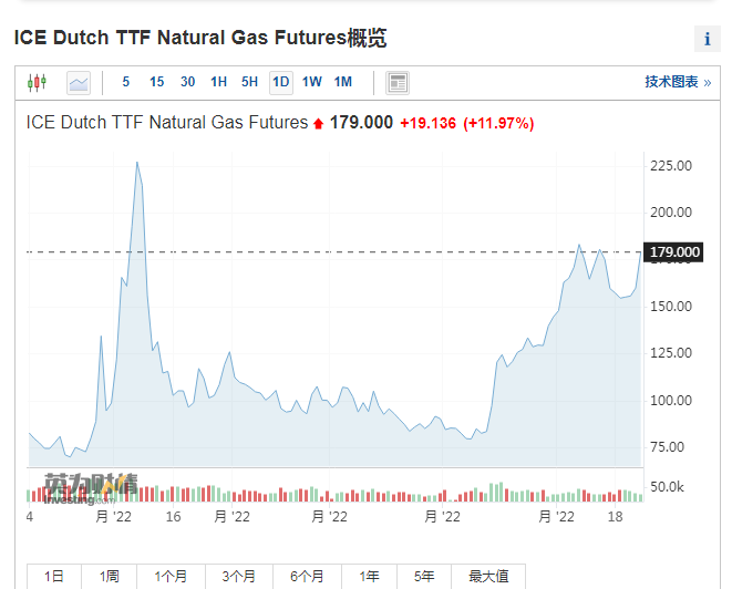 此前,“北溪-1”的另一台涡轮机因送修运输受阻,导致该重要输气管道的满产运行希望渺茫。此番又一台涡轮机即将维修,使得欧洲能源供应问题雪上加霜。截至发稿,欧洲基准荷兰TTF天然气期货价格飙升近12%,美国天然气期货价格也上涨超过3%。