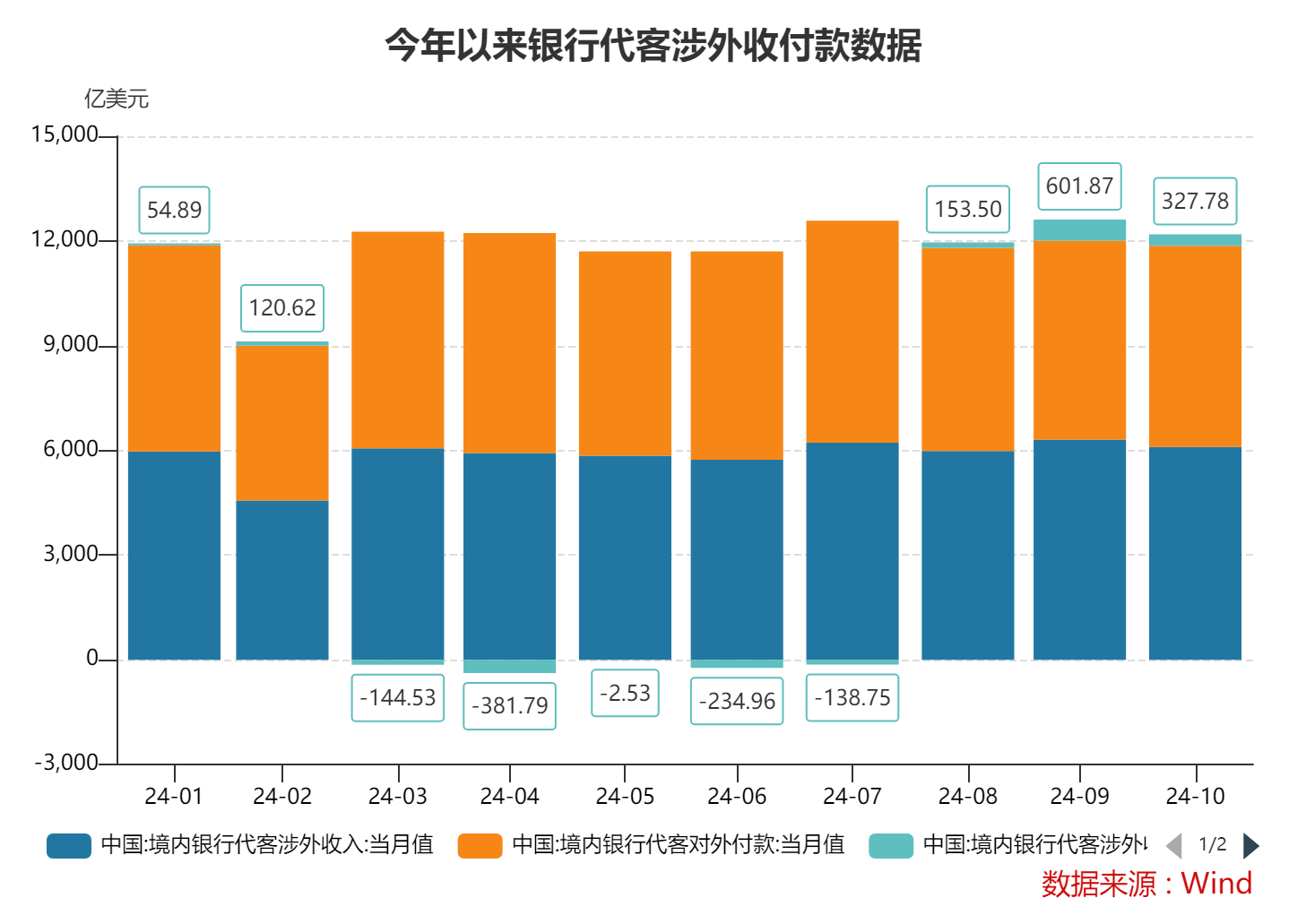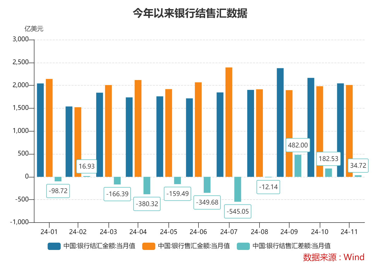 按美元计值,2024年11月,银行结汇2044亿美元,售汇2009亿美元;1至11月累计结汇20970亿美元,累计售汇21966亿美元。同时,11月银行代客涉外收入5932亿美元,对外付款6127亿美元;1至11月累计涉外收入64620亿美元,累计对外付款64459亿美元。