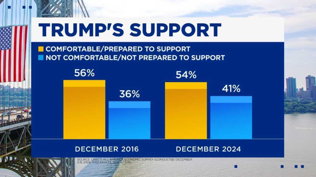 最新民调揭示,尽管当选总统唐纳德·特朗普的竞选议程颇具争议,但多数美国人仍表示支持其第二任期。CNBC全美经济调查数据显示,54%的美国民众“愿意并准备支持”特朗普连任,较2016年微降2个百分点,而41%的人表示“感到不舒服”,这一比例则上升了5个百分点,显示其净支持率有所下降。