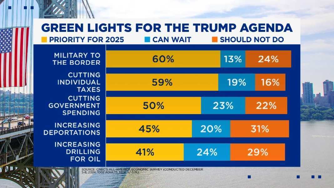 此外,调查还发现,多达73%的人认为拜登任期的经济表现一般或很差。在经济议程上,60%的受访者认为,在边境部署军队以阻止非法毒品和人口入境应成为新政府2025年的首要任务;同时,大多数美国人还支持削减个人税收、加大对无证移民的驱逐力度、缩小政府规模、在联邦土地上开采更多石油以及减税和减少企业监管。