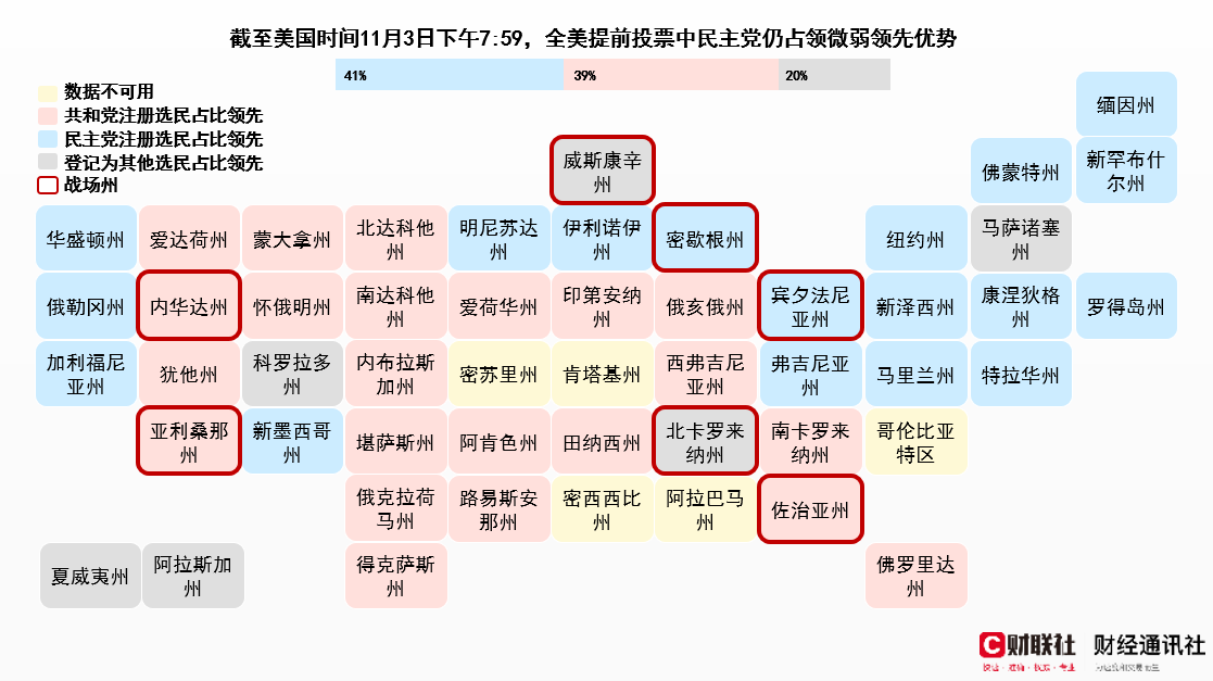 从各州提前投票数据来看,民主党注册选民在18个州领先,而共和党选民则在22个州占据优势。