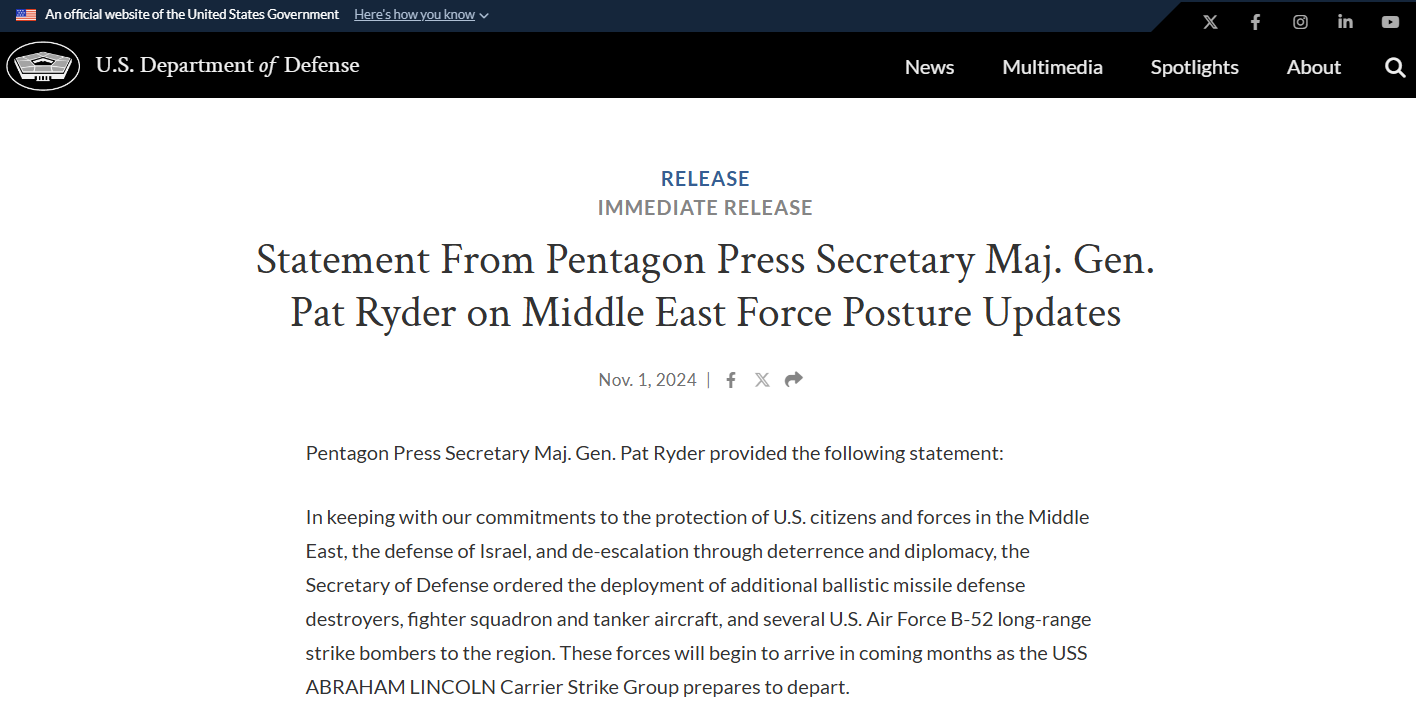 五角大楼新闻秘书帕特-莱德少将在声明中详细指出,奥斯汀部长决定增派弹道导弹防御驱逐舰、一个战斗机中队、空中加油机,并包括数架具备远程打击能力的空军B-52轰炸机。
