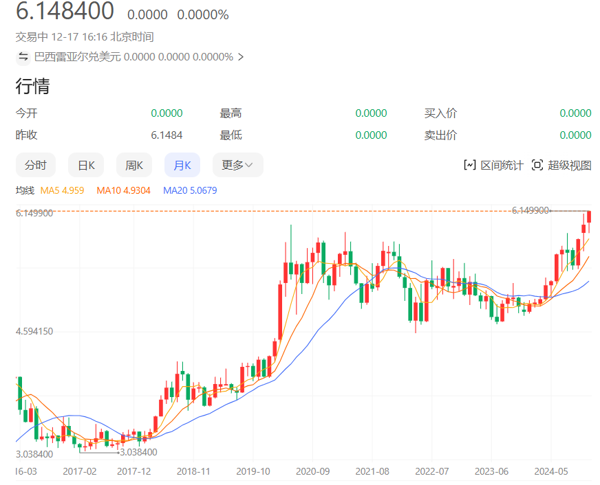 图中展示了美元兑巴西雷亚尔的月度走势,雷亚尔汇率持续走低。