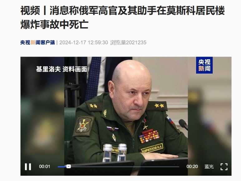 基里洛夫中将在莫斯科梁赞大街爆炸事件中不幸遇难,爆炸原因是安置在电动踏板车上的爆炸物被引爆。俄媒援引消息人士报道称,这起爆炸事件“由乌克兰军方策划和实施”,但乌克兰方面对此暂无回应。