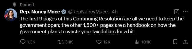 南卡罗来纳州共和党众议员南希·梅斯在社交媒体上直言不讳地表示:“他们把所有东西都塞进了一张巨额账单里。如果你投反对票,他们就会让你感到内疚。我支持飓风救援,但请不要再试图掩饰政府的不计后果的支出。”