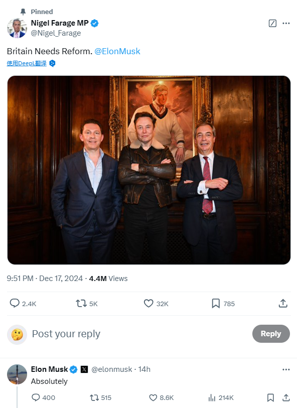 此前,法拉奇于当地时间17日在社交平台X上率先分享了与马斯克的合照,并配文强调“英国需要改革”。马斯克对此迅速回应,表示“绝对需要”。(信息来源:英国每日电讯报及界面新闻)