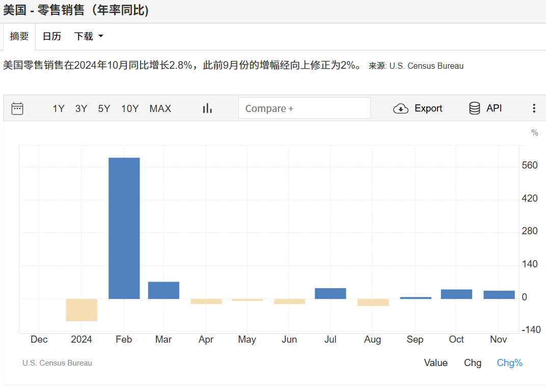 2024年美国零售销售数据整体稳健,消费需求持续增长,经济展现出韧性,尽管期间存在一定的波动性。2024年10月,美国零售销售额环比增长0.4%,9月增幅经上修为0.8%,高于市场预期的0.3%。其中,电子产品和家电商店销售增长最大(2.3%),其次是汽车经销商(1.9%)和餐饮服务及饮料场所(0.7%)。