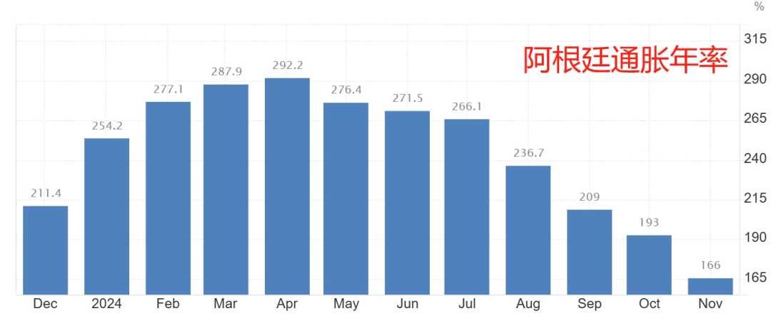 米莱总统任期第一年已圆满落幕,其经济改革措施正显现积极成效。最新数据显示,阿根廷11月通胀月率已降至2.4%,远低于他上任之初的26%。年通胀率也从高位的166%逐渐回落。这一改善使得阿根廷财政状况实现历史性转变,前11个月财政盈余显著,终结了数十年的赤字局面。