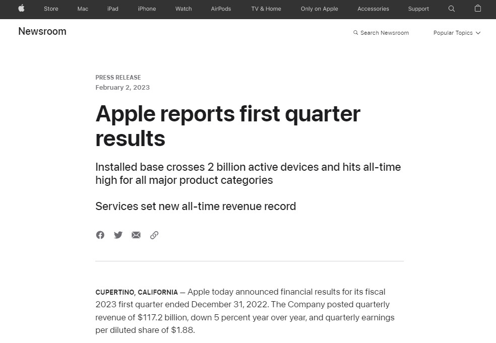 苹果发布2023财年Q1财报:营收同比下滑,设备激活量达20亿