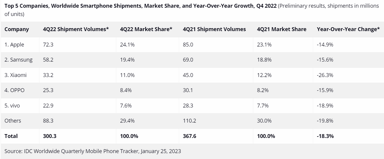 (2022年四季度全球手机出货量数据,来源:IDC)