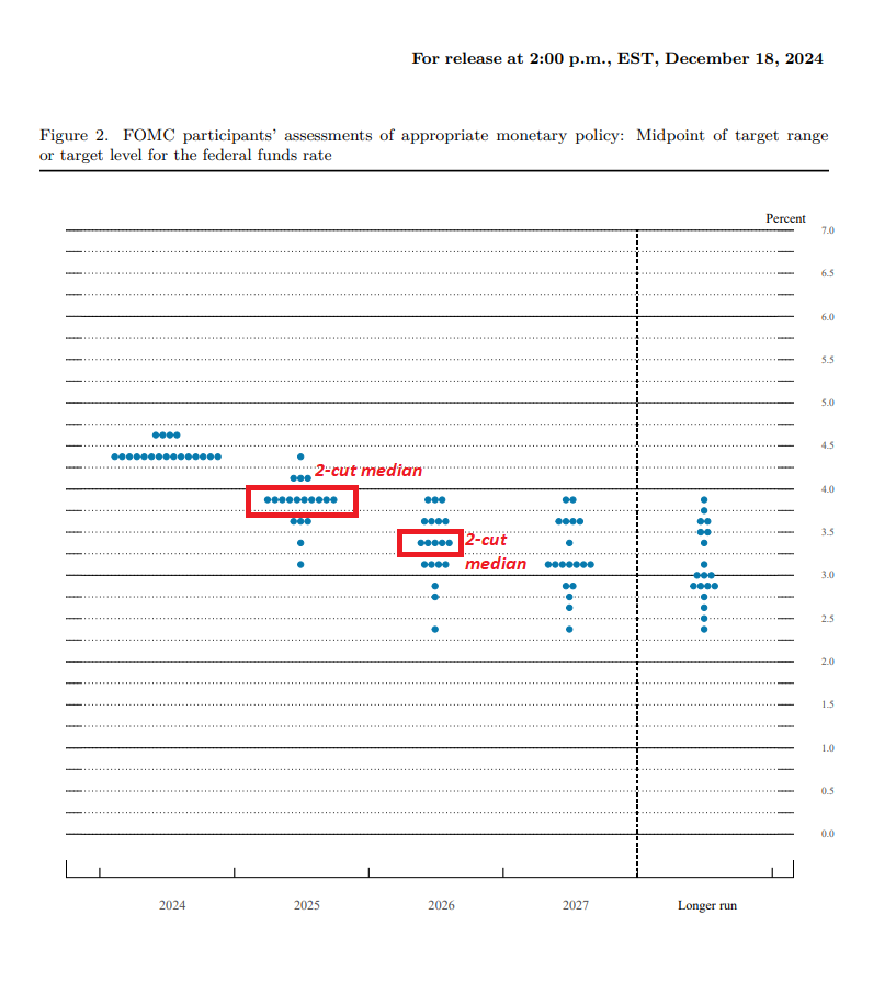 新华财经上海12月19日电(葛佳明)当地时间12月18日(周三),美联储在2024年最后一次FOMC会议上决定将联邦基金利率目标区间下调25个基点至4.25%-4.50%,符合预期,但传递出更为“鹰派”的未来降息信号,暗示降息步伐可能放缓,导致全球市场经历剧烈震荡。