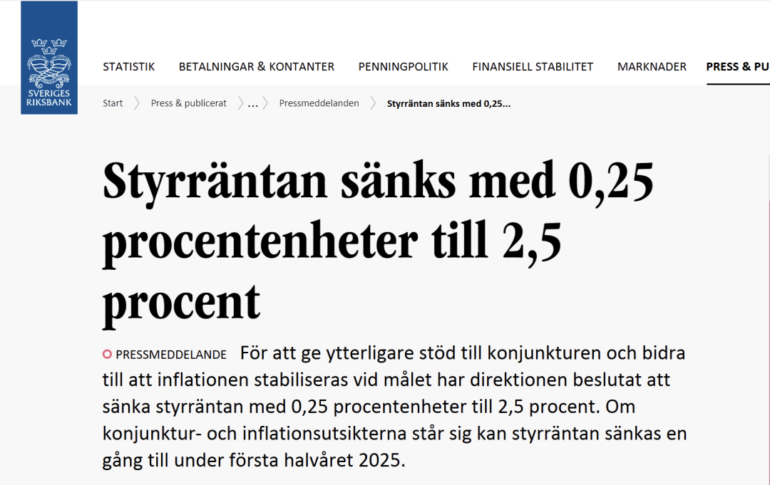 在“超级央行周”的持续进行中,瑞典中央银行于12月19日宣布,自2025年1月8日起,将基准利率降低25个基点至2.5%。这一决定旨在进一步促进经济活动,并稳定通胀水平。