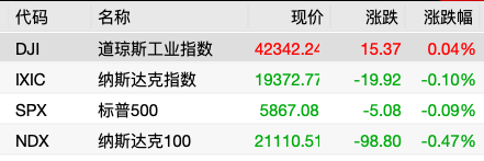 美东时间12月19日(周四),美股市场呈现出先扬后抑的态势。三大指数开盘后一度走高,但随后逐渐回落。道琼斯工业平均指数结束了此前的十连跌趋势,最终微涨0.04%,报收于42342.24点;纳斯达克综合指数则下跌0.1%,报收于19372.77点;标准普尔500指数同样收跌0.09%,报收于5867.08点。