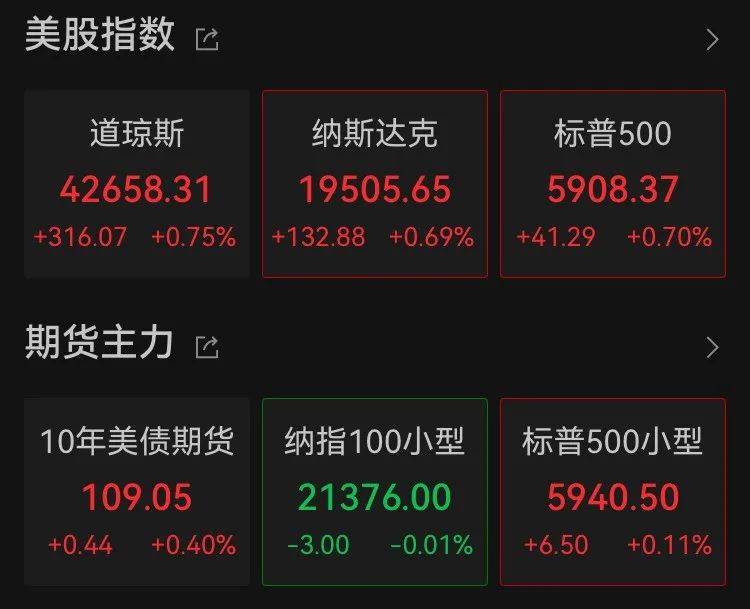 美股市场方面,纳斯达克100指数期货和标普500指数期货一度分别下跌1.5%和超过1%。然而,美股三大指数在开盘后迅速反弹,截至发稿时,道指上涨0.75%,纳指上涨0.69%,标普500指数上涨0.70%。