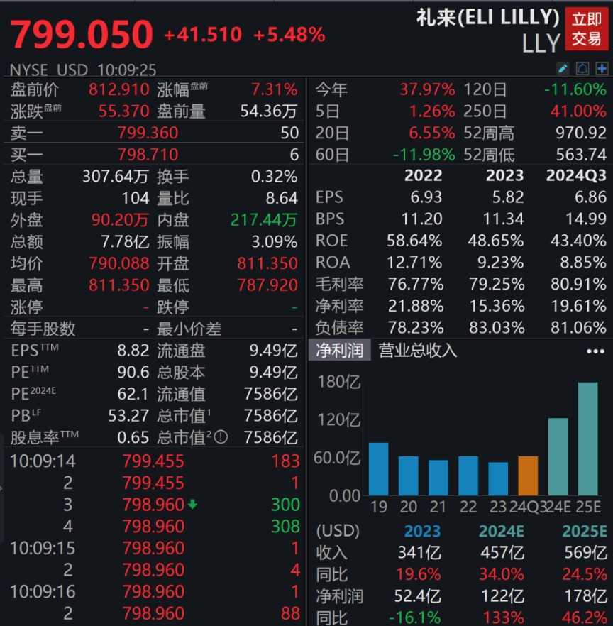 在个股方面,诺和诺德股价在德国和英国市场大幅下跌,一度接近30%,截至发稿时跌幅收窄至20%。该公司发布的公告显示,其减肥药CagriSema在试验中表现良好,但帮助超重患者减重的幅度低于预期,导致其股价大幅下跌。与此同时,诺和诺德的竞争对手礼来股价在美股盘前直线拉升超10%,截至发稿时涨5.48%。