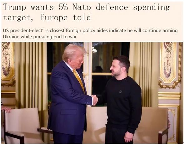 据英国《金融时报》20日报道,美国当选总统特朗普的团队已向欧洲官员提出要求,希望北约成员国将军费开支占国内生产总值(GDP)的比重由现行的2%提升至5%。
