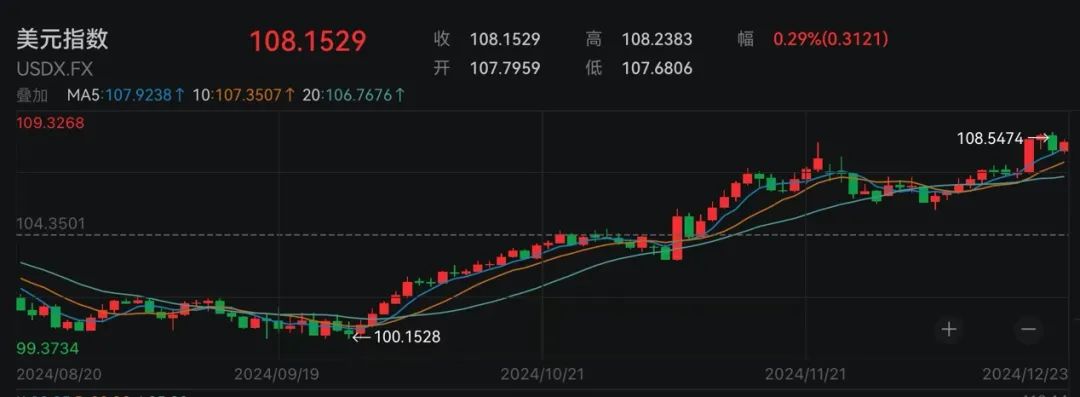 其他市场方面,美元指数维持高位震荡,截至发稿时,美元指数上涨0.29%,报108.1529。纽约商品交易所的黄金期货价格小幅下跌0.46%,白银期货价格则小幅上涨0.57%。