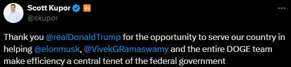 库普尔回应称,将助力“政府效率部”(DOGE),使效率成为联邦政府的核心原则。同时,特朗普提名斯里拉姆·克里希南(Sriram Krishnan)为白宫科技政策办公室人工智能高级政策顾问,以确保美国在AI领域的领先地位。克里希南曾是Windows Azure创始成员,现任a16z普通合伙人,拥有丰富的科技行业背景,曾在微软、雅虎、Meta、Snap及推特等科技巨头担任要职。