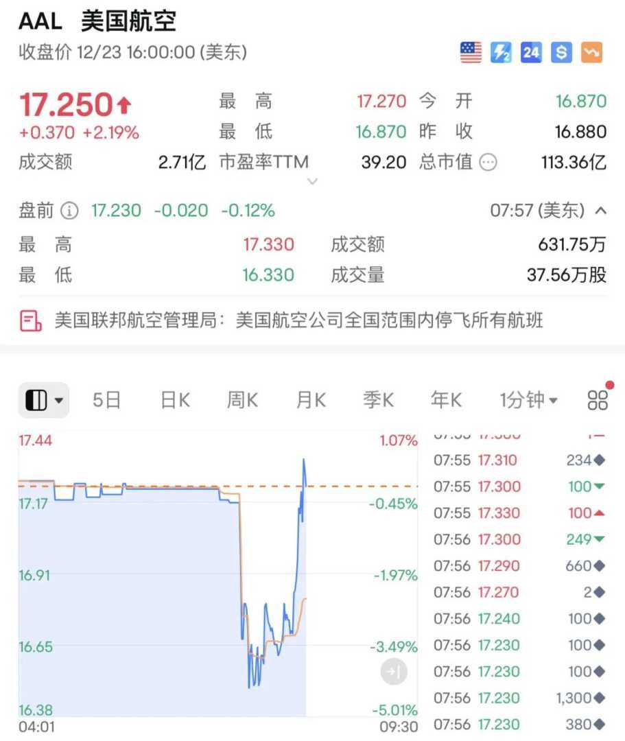 受此消息影响,美国航空美股盘前一度跳水,跌幅超过5%。但随后,美国联邦航空管理局宣布取消了全美范围内的停飞令,美国航空股价也迅速反弹,基本收复了全部跌幅。
