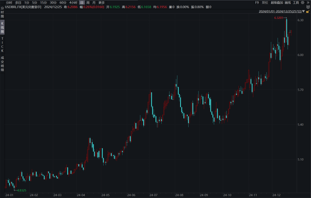 投资者对巴西政府能否缩减开支并实现财政可持续性表示怀疑,导致雷亚尔汇率跌至历史低点。同时,美联储货币政策也对雷亚尔汇率产生了影响。美联储公布的点阵图显示,对2025年的降息次数由9月份预测的4次缩减为2次,利率中值预测上调至3.9%。这导致美元走强,进一步打压了雷亚尔。