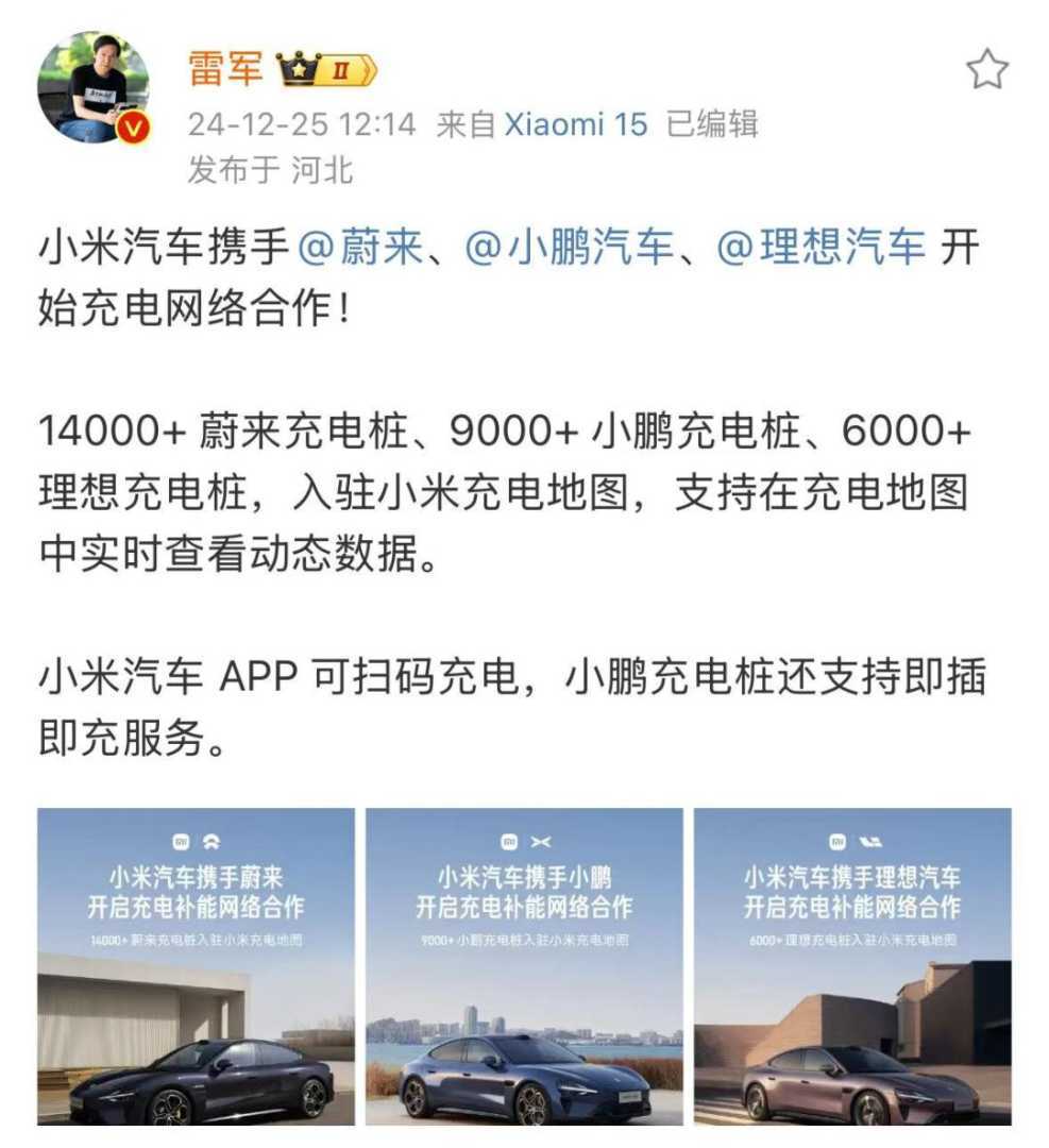 12月25日,小米汽车宣布与蔚来汽车、小鹏汽车、理想汽车达成充电网络合作,共享上万根充电桩,入驻小米充电地图。业内指出,新能源汽车产业已迈入产业融合、资源共享的新阶段,此次合作正是充电桩资源共享与整合的典范。