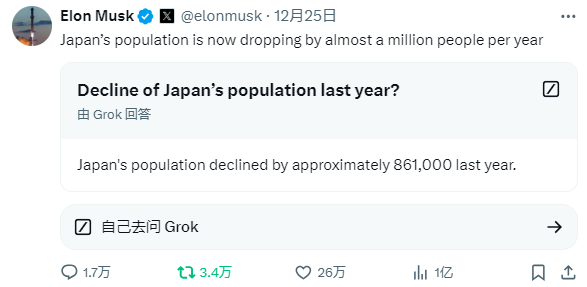 马斯克首先指出,日本人口目前每年减少近100万,并引用了旗下AI模型GroK的数据,确认去年日本人口减少了约86.1万。