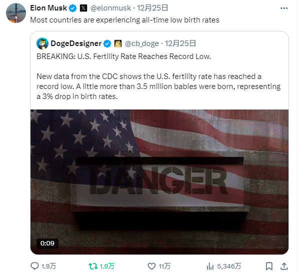 全球首富马斯克在圣诞节期间持续关注全球生育率下降问题,发布推文指出日本和美国等国家的出生率创下历史新低,并表达了对人口危机的担忧。