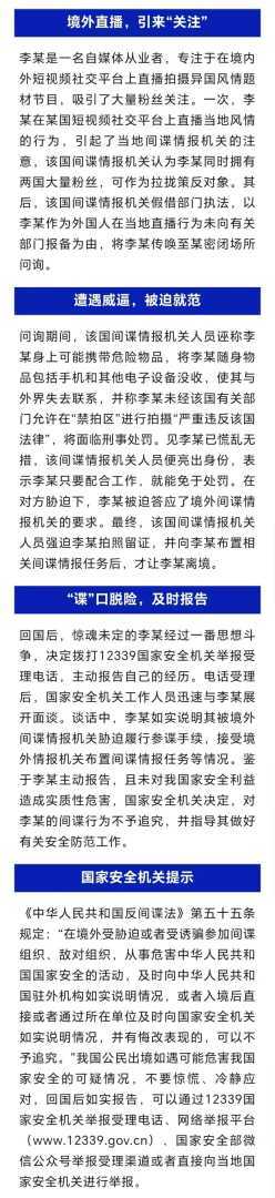 近年来,我国公民在出国(境)期间频繁遭遇境外间谍情报机关的攀拉策反,构成风险隐患。广大公民应及时向国家安全机关举报,共同维护国家安全和个人权益。