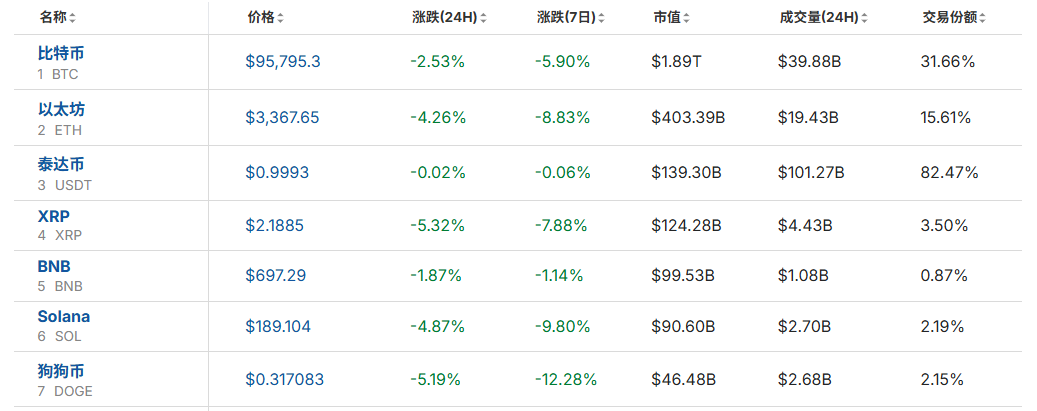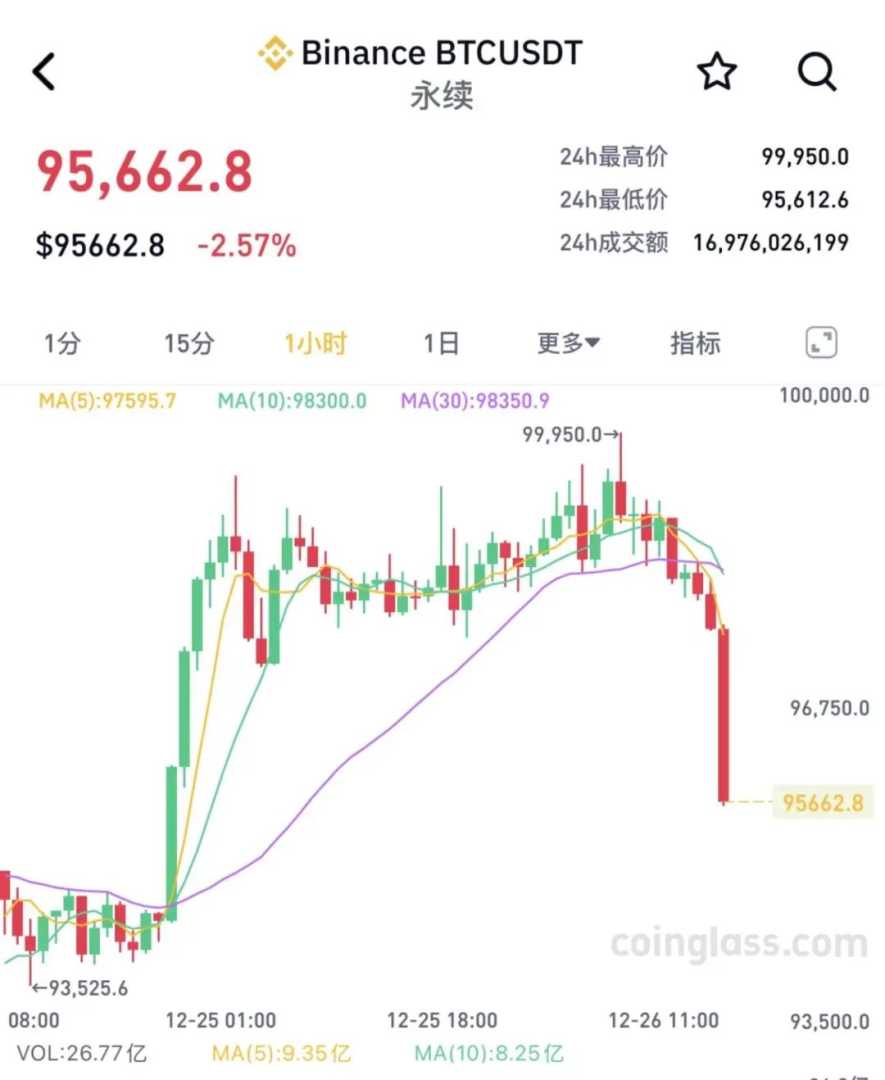 比特币价格在今日凌晨一度突破99900美元的高点,但随后迅速回落,跌破96000美元,目前报价为95662.8美元,24小时内的跌幅已扩大至2.57%。这一波动不仅影响了比特币本身,还带动了以太坊、狗狗币、艾达币等其他加密货币的下跌。