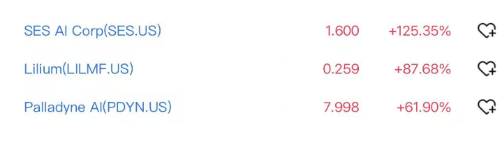 此外,美股无人机概念股也迎来了大涨,其中Lilium涨幅超过87%,Palladyne AI涨幅超过60%,SES AI涨幅更是超过100%。