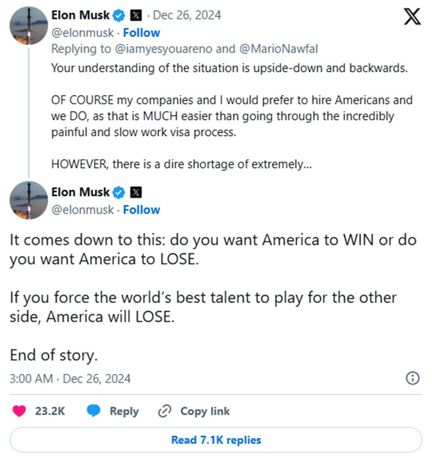 近期,美国国会已开始就移民计划进行初步讨论。值得注意的是,共和党议员们正在考虑一项新政策,旨在增加高科技移民的数量,这一提议得到了包括马斯克在内的多位科技界亿万富翁的反复呼吁。马斯克周三公开表示,优秀工程人才的短缺已成为制约硅谷发展的关键因素,而移民劳动力则是推动美国创新不可或缺的力量,他呼吁政府进一步放宽高科技移民政策。