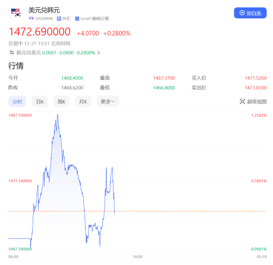 韩国国会投票通过了对代总统韩德洙的弹劾动议案,金融市场受到冲击,韩元对美元汇率和韩国股市均大幅下跌。韩国企业商业信心也创下四年来最大跌幅。