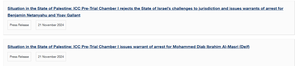 当地时间周四(11月21日),总部位于荷兰海牙的国际刑事法院(ICC)正式对以色列总理内塔尼亚胡、前国防部长加兰特,以及巴勒斯坦伊斯兰抵抗运动(哈马斯)领导人穆罕默德·迪亚卜·易卜拉欣·马斯里(戴夫)发布了逮捕令。